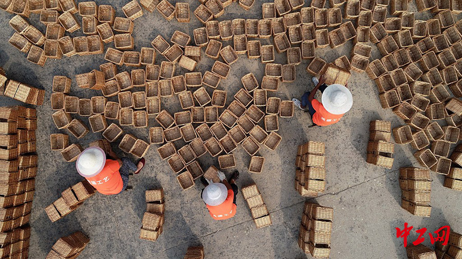 2020年7月25日,山东临沂,在郯城县庙山镇卢恩珍创办的工艺品公司,工人们在整理晾晒的柳编产品(无人机照片)。(房德华/视觉中国)
