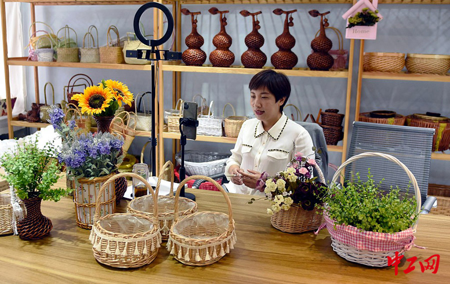 2020年8月26日,山东临沂,面对国内国际柳编产品市场疲软,卢恩珍采取直播形式销售柳编产品。(房德华/视觉中国)
