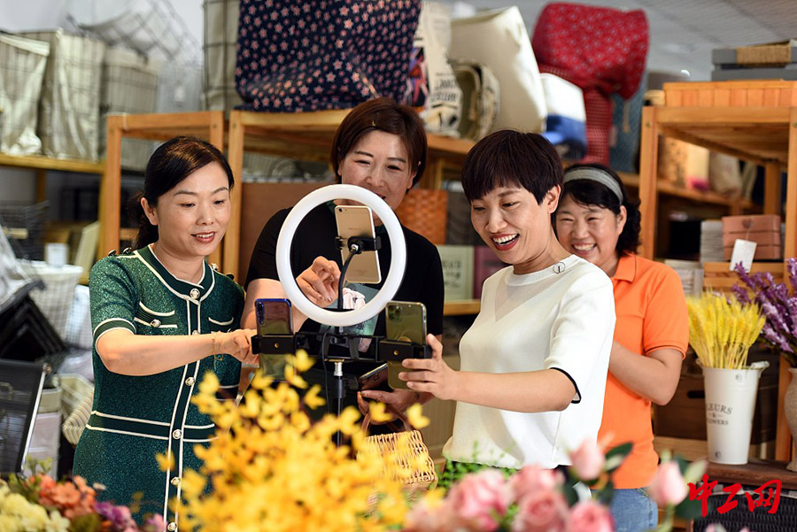 2020年7月28日,山东临沂,卢恩珍(右前)向当地网红学习“直播带货”宣传推销柳编工艺品。(房德华/视觉中国)