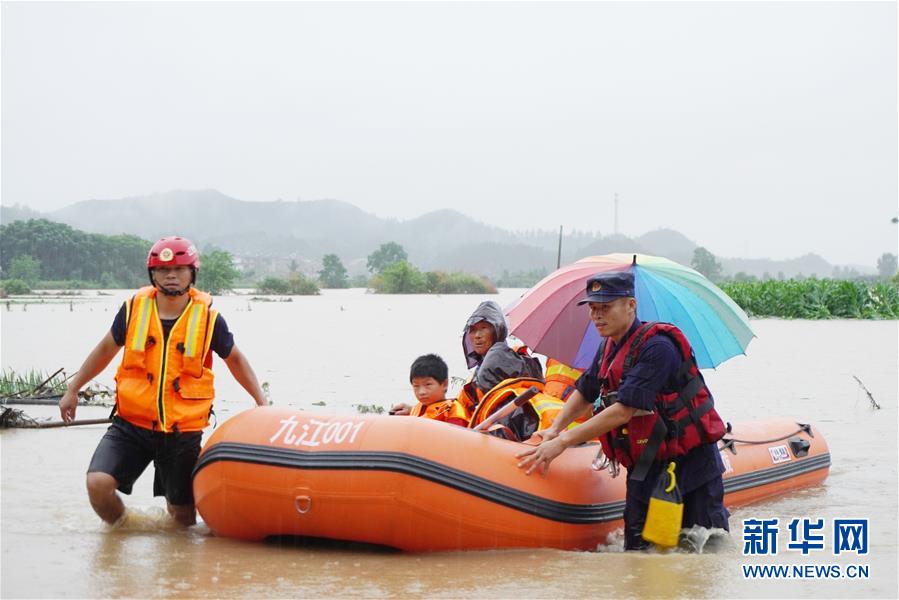 江西省九江市彭泽县杨梓镇金峰村雷洲组,九江市消防救援支队作战训练科副科长覃旭华(右一)在转移群众(2020年7月7日摄)。新华社发(刘佳明摄)