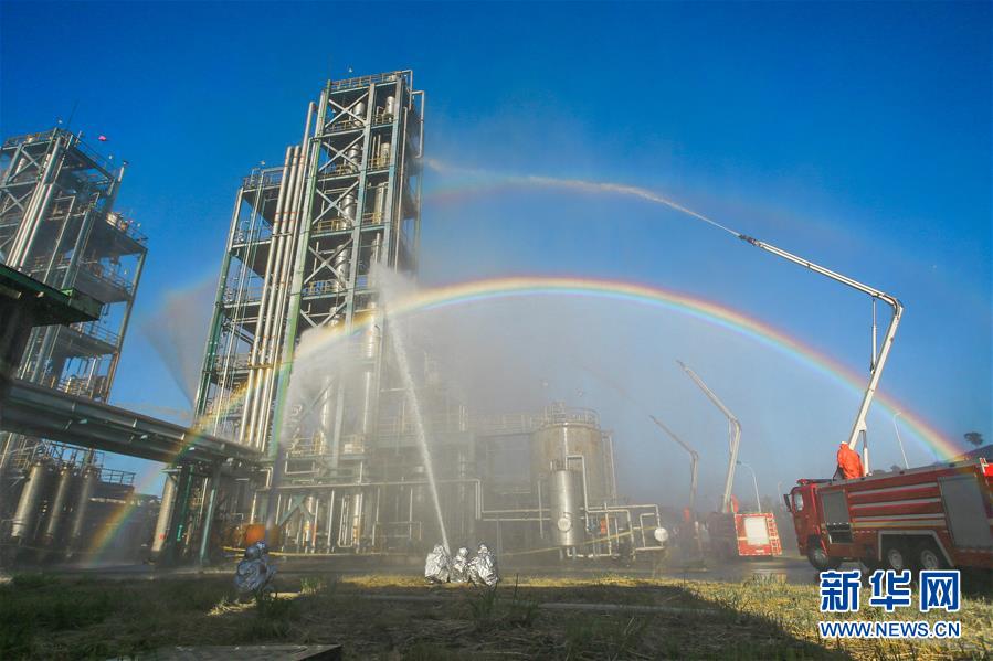 九江市消防救援支队参与在九江石化金鸡坡油库举行的全省跨区域石油化工救援演练(2019年9月19日摄)。新华社发