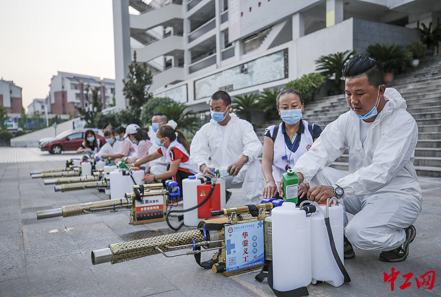 8月29日,四川省广安市华蓥市巡回到城区中小学及幼儿园为师生活动场所消毒杀菌的义工,在做消杀前的准备工作。