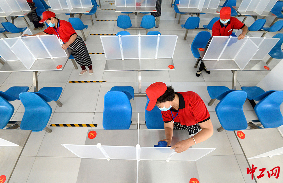 8月30日,河北邯郸,峰峰第一中学的工作人员在打扫餐桌卫生。开学在即,邯郸市各级学校积极对教学楼、食堂、宿舍等区域进行全面清洁消毒,完善各项防疫措施,为即将返校的学生营造安全的学习环境。(郝群英/人民视觉)
