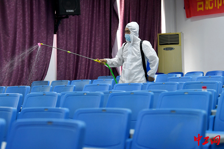 8月30日,合肥,在瑶海区和平路小学,工作人员在教室内进行消杀。当日,瑶海区和平路小学组织专业工作人员清洁校园,并对学校教室、走廊、楼梯、座椅、多媒体室等公共场所进行集中消杀,做好准备迎接新学期的到来。(解琛/人民视觉)