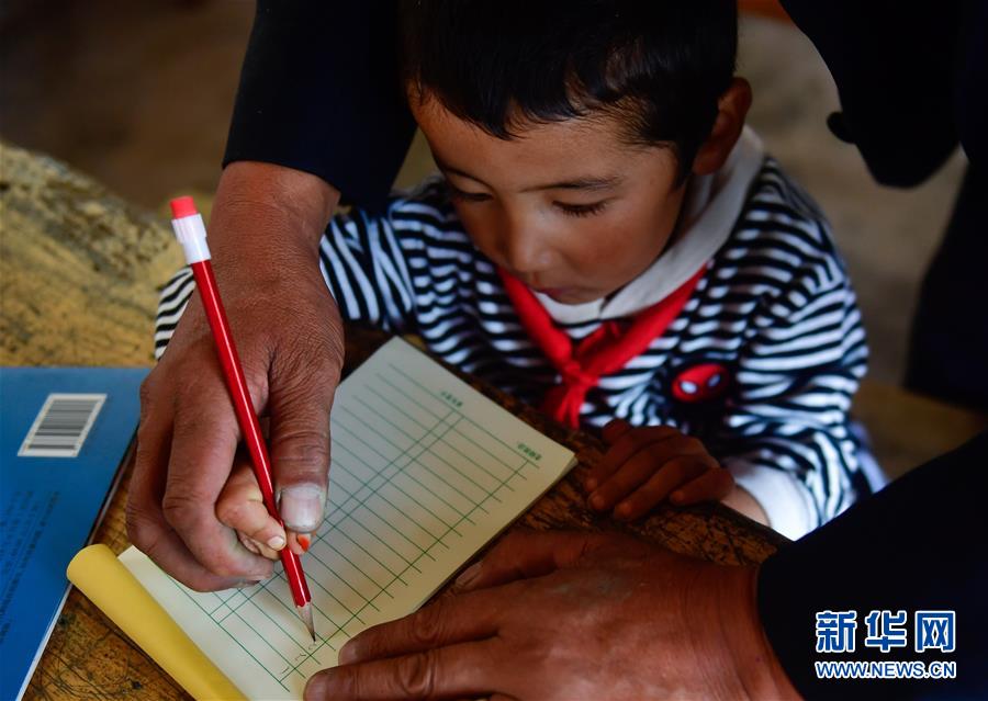8月31日,在来塘村学校,完么仁增老师在指导一年级学生马文辉学习。 新华社记者 张龙 摄