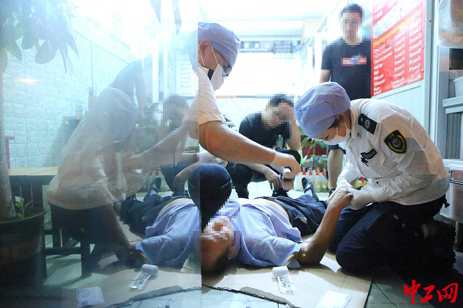 8月22日,上海,23:24,金丰路一59岁男子短暂性脑缺血发作,急救医生石柳娴问诊中得知,这位男子晚上喝过3两白酒,跪在地上急救时,石柳娴关切地对意识模糊的男子说:“不能喝酒就不要喝嘛!你看你这多伤身体!”(签约供稿人/视觉中国)