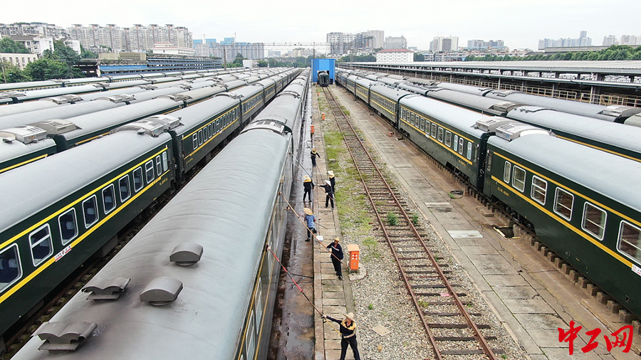目前,普速列车都是人工清洗,一个工人绕着车辆清洗一圈下来,要走上一到两公里。每天正常80辆列车下来,基本要走7公里以上。
