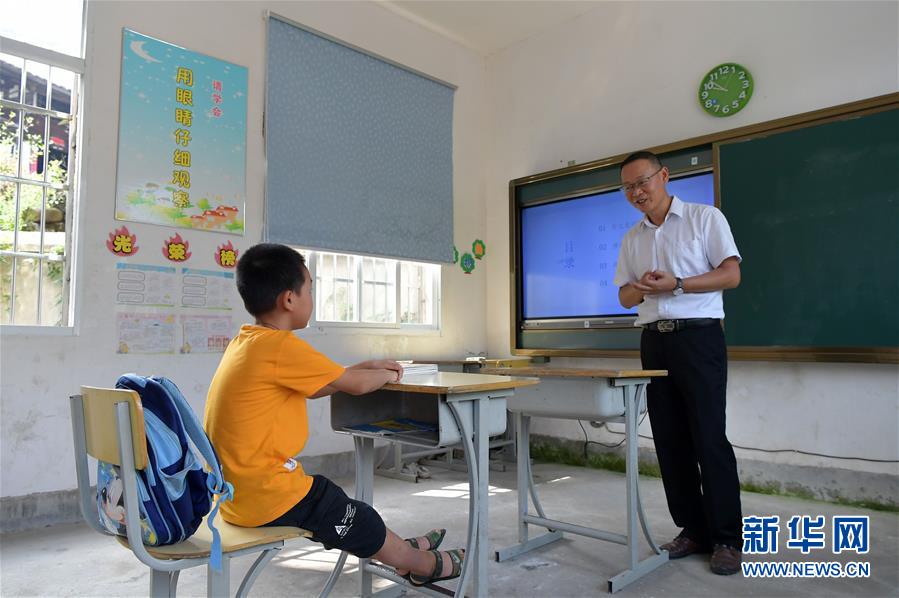 9月1日,在袁家村群众小学,老师刘珍斌给二年级唯一一名学生上课。