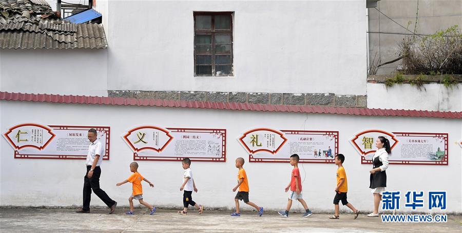 9月1日,在袁家村群众小学,校长邓艳萍(右一)和老师刘珍斌带着学生进入教室。新华社记者 彭昭之 摄
