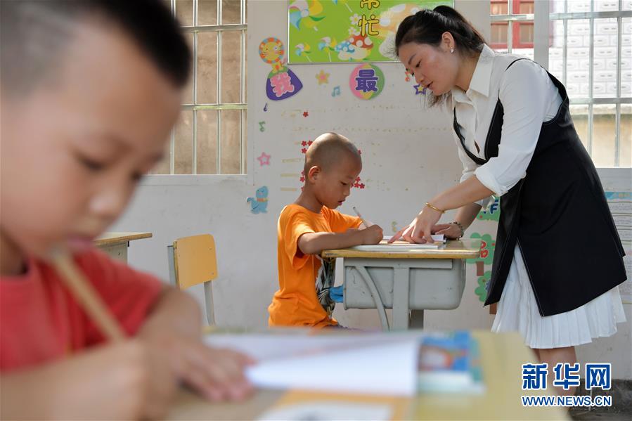 9月1日,在袁家村群众小学,校长邓艳萍教学生在新书本上写下名字。新华社记者 彭昭之 摄