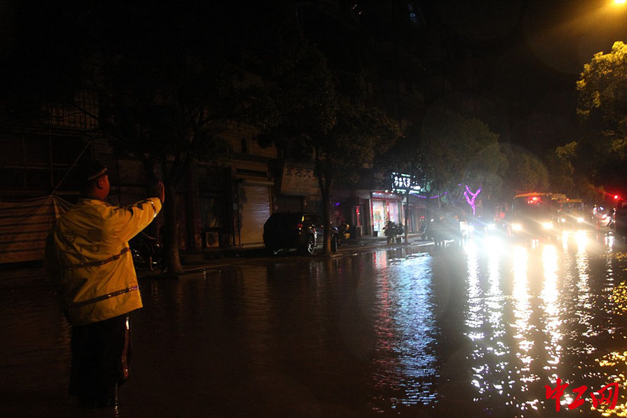 9月1日,浙江省舟山市岱山县公安局民警提醒过往车辆和行人注意安全。(邹训永/人民视觉)