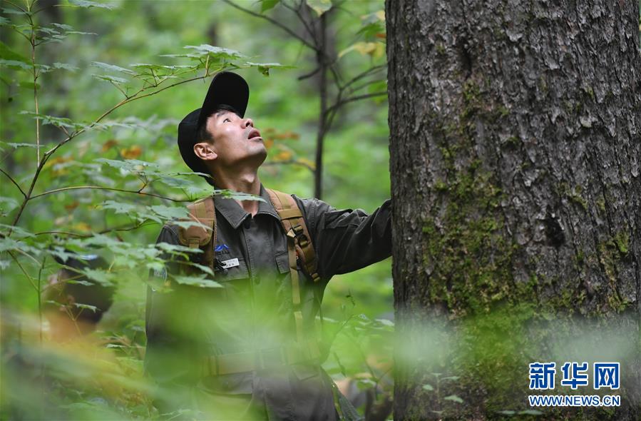 9月2日,巡护员在吉林长白山国家级自然保护区的森林里查看树木上的生长情况。 吉林长白山国家级自然保护区维东自然保护站负责管区面积33720公顷,目前有90人,巡护员们经常在森林里步行,在野外露营地值守,守护着长白山的一草一木。 新华社记者 颜麟蕴 摄