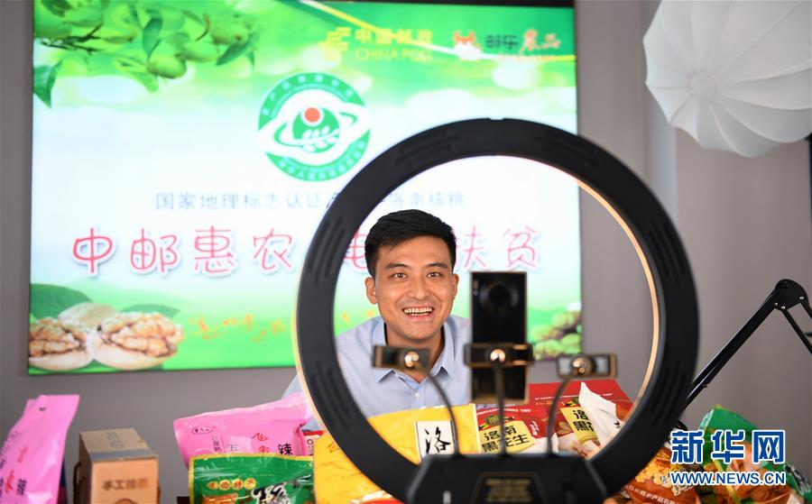 9月1日,在洛南县邮政公司中邮惠农共享直播间,杨明为洛南农副产品带货直播。 新华社记者 李一博 摄