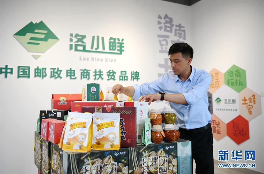 9月1日,在洛南县全国核桃交易中心展厅,杨明整理洛南县电商扶贫品牌“洛小鲜”的相关产品。 新华社记者 李一博 摄