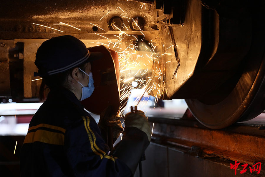 车钩装置是保障汛期行车安全的关键部件,对焊修的要求尤其严格,经验丰富的殷燕飞更是深知此次作业的重要性。只见她一丝不苟地检查松脱的位置,不一会儿就确定了焊修的方式,随后便小心翼翼地开始作业,瞬间整个车库火星四射,焊花四处飞溅,殷燕飞时而站立,时而半蹲,时而下蹲,摆出各种卷曲的姿态。殷燕飞熟练进行着焊修作业,没过多久车钩防跳装置焊修完毕,细致的她反复检查焊缝,确认达到技术要求。