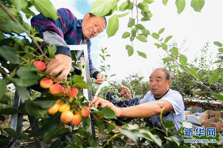 9月2日,在三星村的一处果园,孙显富(右)和村民一起采摘沙果。