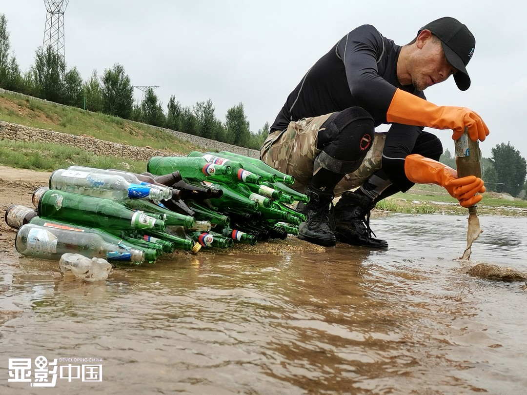 高伟把80多个玻璃瓶分多次从石人湾中心地带背回停车地,并进行清洗。