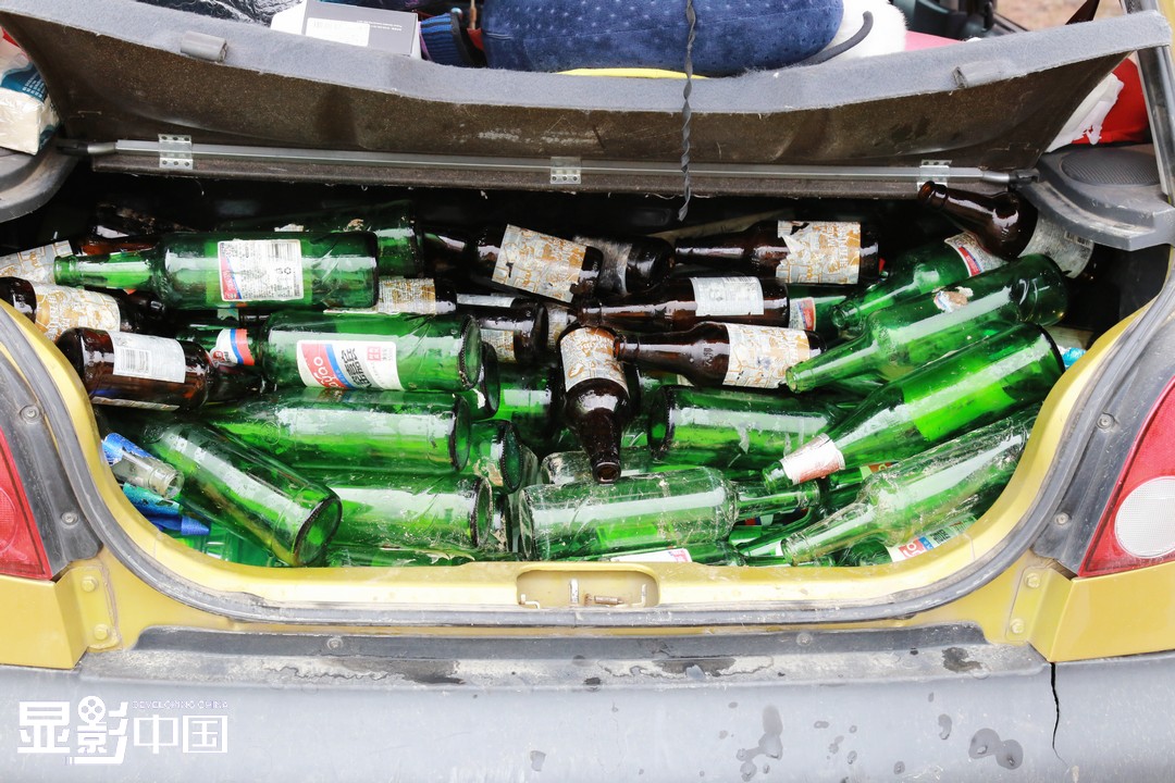 塑料瓶子放在车架上,玻璃瓶装入后备箱。高伟的这趟捡垃圾之行即将结束。
