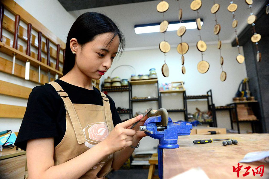 8月28日,在兰州,有位快乐的“女木匠”,而且还是个95后。木头是宋乐乐从小到大最情有独钟的宝贝。父亲以前是木匠,常用木头做家具,她自己则坐在一旁拿着木块玩耍,久而久之,乐乐对于木头愈发感兴趣。(图片来源:视觉中国)