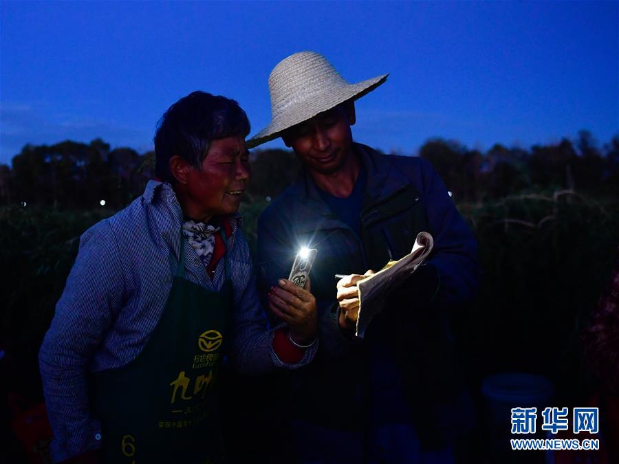 9月2日,在德令哈市尕海镇泉水村,李福文(右)在给雇佣的枸杞采摘工结算工资。 新华社记者 张龙 摄