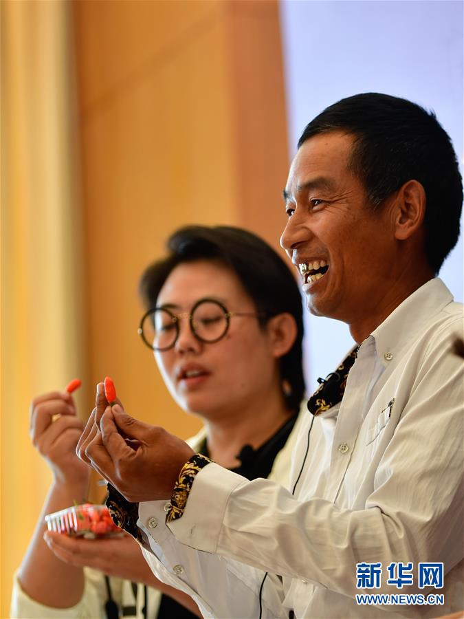 9月3日,在海西州会展中心的直播间内,李福文(右)在展示自家枸杞。新华社记者 张龙 摄