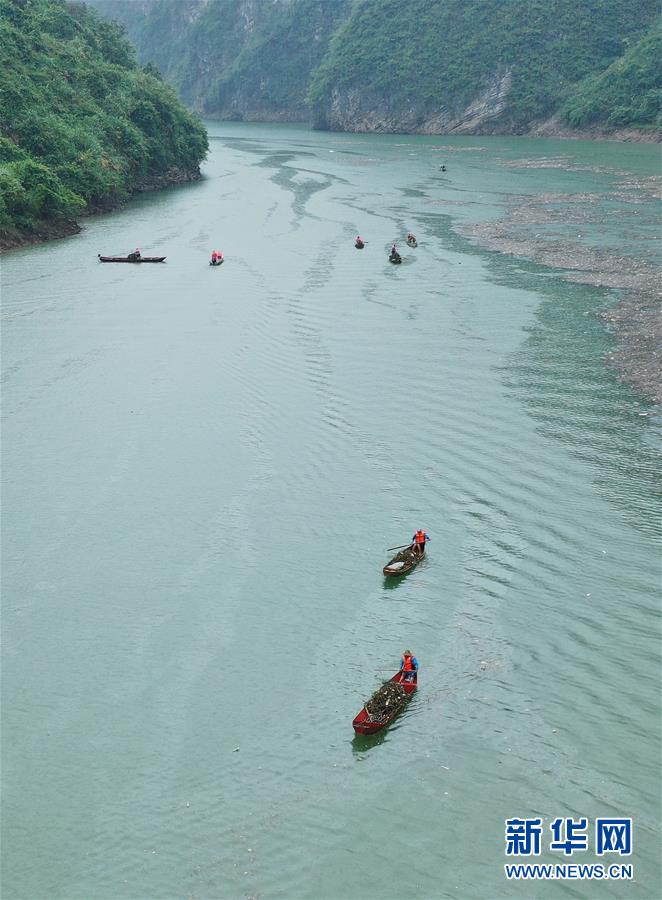 9月6日,在湖南省张家界市永定区茅岩河上,当地村民在清理漂浮物(无人机照片)。新华社发(吴勇兵 摄)