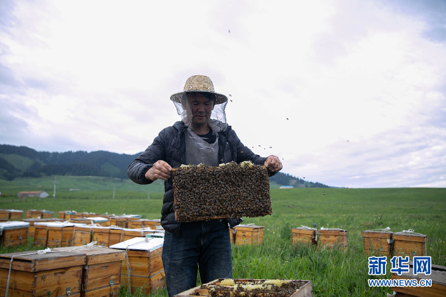努尔木拜观察转运后的蜜蜂情况。由于幼时被蜜蜂蛰过,努尔木拜摆弄得很小心。新华网 杲均丰 摄