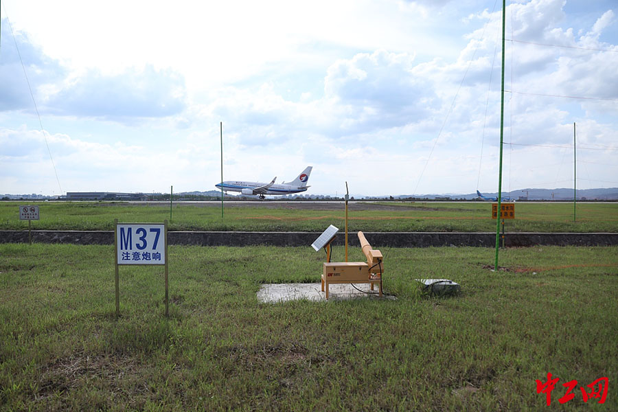 8月4日,重庆,“砰砰砰!”机坪上的煤气炮发出驱鸟声。据介绍,目前机场驱鸟形式和装置多种多样。在听觉驱鸟方面,包括了功能驱鸟车、煤气炮、声波驱鸟器等;视觉驱鸟有风动驱鸟器、彩色风轮、彩旗、驱鸟模特、爆闪灯等。(来源:视觉中国)