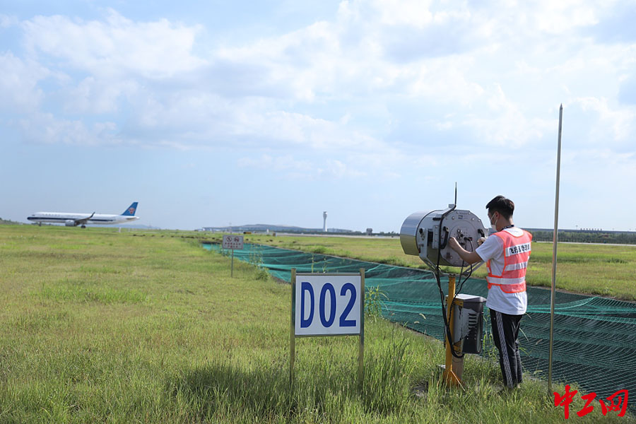 8月4日,重庆,机场空旷的草坪是鸟类喜爱的栖息地之一,除了驱鸟,驱鸟员们还要定期检查草坪植物生长情况,定期割草、杀虫,切断飞鸟的食物链。(来源:视觉中国)