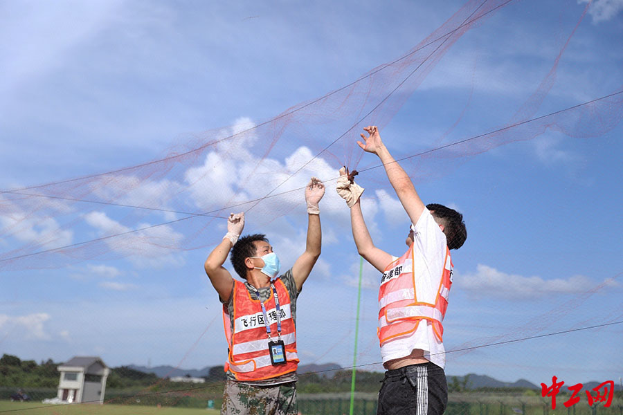 8月4日,重庆,下午17时,在飞行区巡查的驱鸟员发现了一只误闯的小鸟,被困在拦鸟网上,两名驱鸟员小心翼翼地将它从网上取下来。(来源:视觉中国)