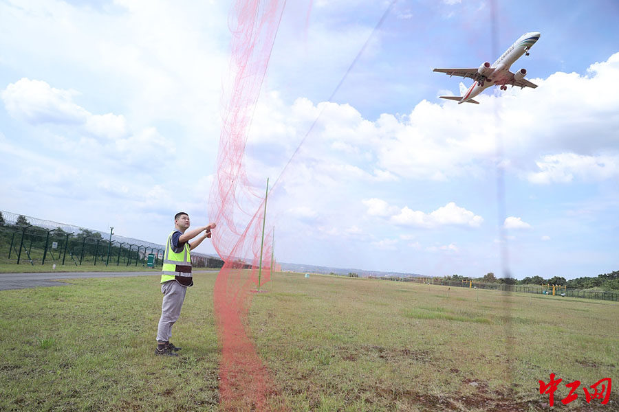 8月4日,重庆,近日重庆高温晴热,烈日暴晒下的机坪热浪滚滚,整个飞行区没有任何遮阳物,飞行区管理部护场管理部驱鸟分队副队长邓迪正在检查拦鸟网。今年是邓迪从事驱鸟的第八年,他告诉我们,拦鸟网对穿越跑道和滑行道的鸟类起惊吓和阻拦作用,又不会对鸟类造成伤害。(来源:视觉中国)