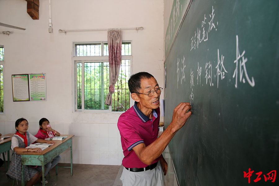 9月7日,四川内江,在东兴区郭北镇亢家村小学校,曾会章在给学生上书法课。(来源:视觉中国)