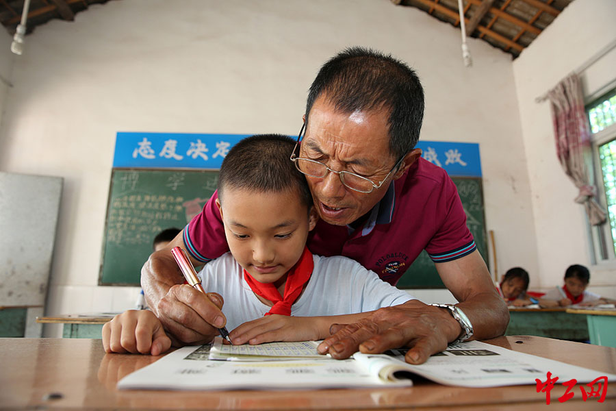 9月7日,四川内江,在东兴区郭北镇亢家村小学校,曾会章在指导学生。(来源:视觉中国)