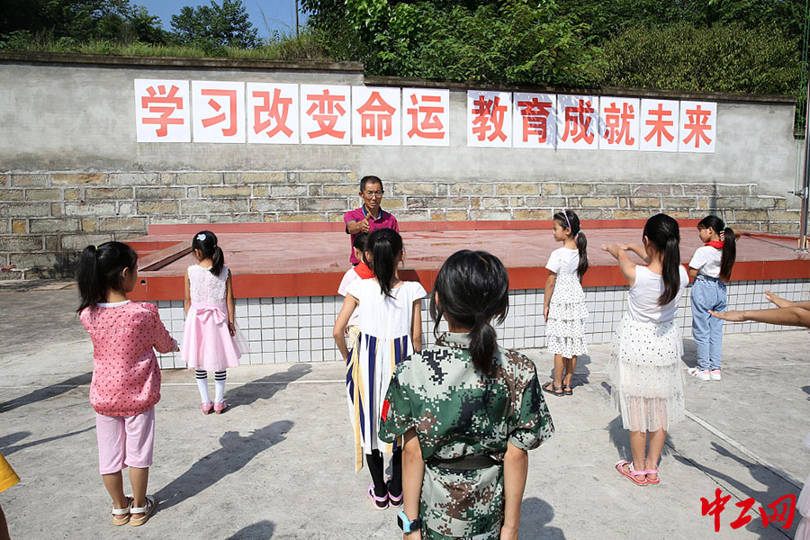 9月7日,四川内江,在东兴区郭北镇亢家村小学校,曾会章正在给学生上体育课。(来源:视觉中国)