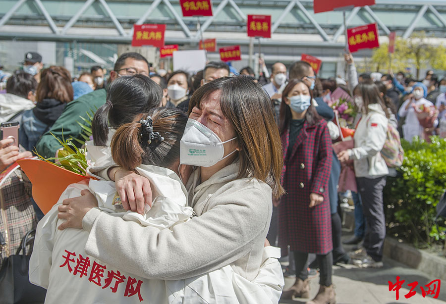 4月4日,天津医科大学总医院100多名整建制支援湖北武汉的医疗队员解除隔离,与家人团聚。(来源:人民视觉)