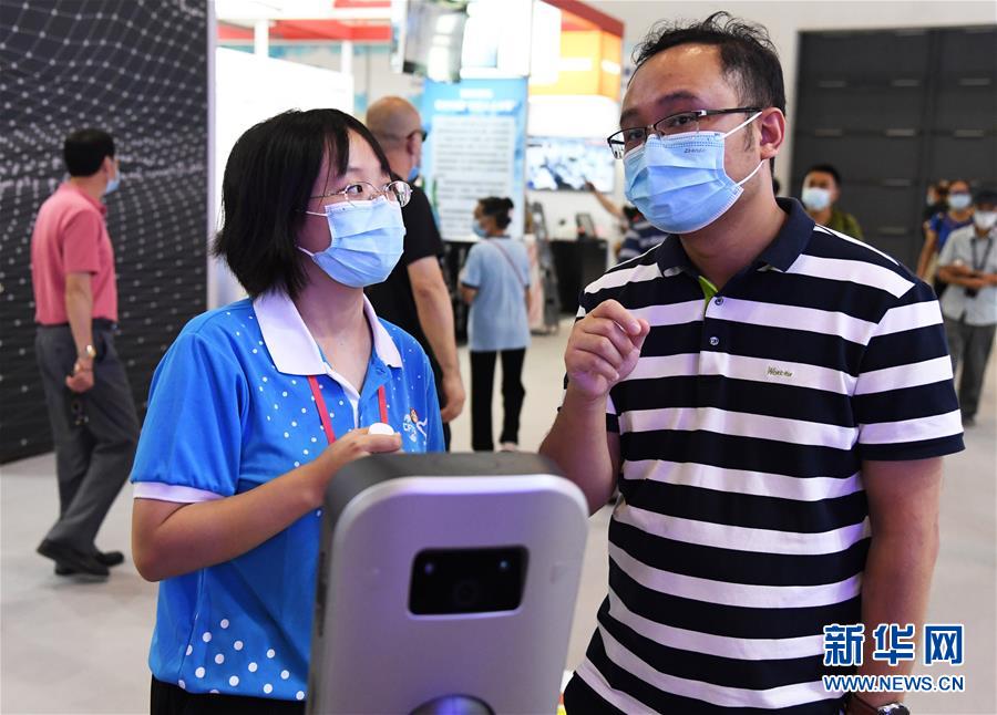 9月8日,在服贸会综合展区,志愿者(左)为观众提供咨询服务。 2020年中国国际服务贸易交易会于9月4日至9日在北京举行。服贸会上的志愿者为观众和相关与会人员提供信息咨询、路线指引等多种服务。 新华社记者 任超 摄