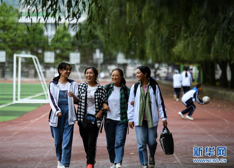 在越西县西城中学,莫色小兰(左二)和学生在操场上散步(9月6日摄)。新华社记者 王曦 摄