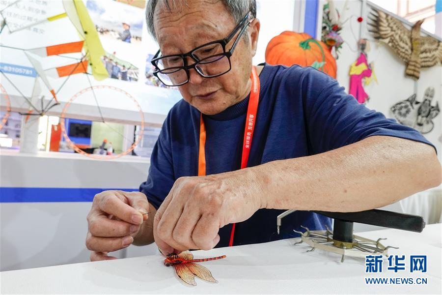 9月8日,陈业嘉在组装自制的蜻蜓风筝。因为年岁高视力不好,在组装微型风筝时,他需要戴两个眼镜。 新华社记者 张笑宇 摄