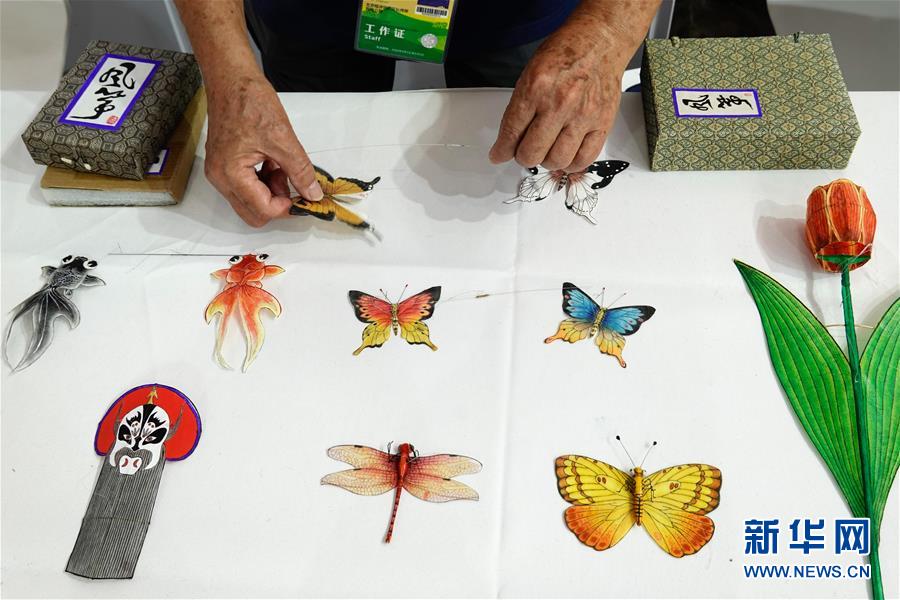 9月8日,陈业嘉在服贸会文化体育融合展区北京市风筝协会展台摆放自制的微型风筝。 新华社记者 张笑宇 摄