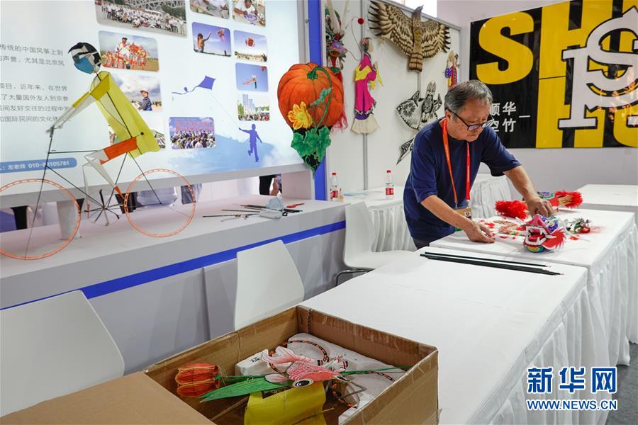 9月8日,陈业嘉在服贸会文化体育融合展区北京市风筝协会展台摆放风筝。 新华社记者 张笑宇 摄