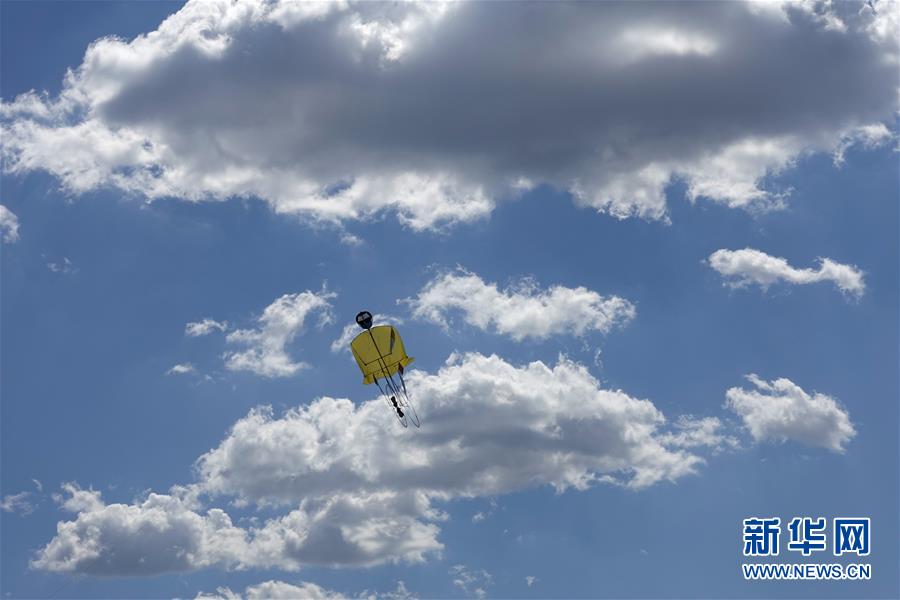 9月8日,陈业嘉在服贸会室外展区放飞自制的风筝。 新华社记者 张笑宇 摄