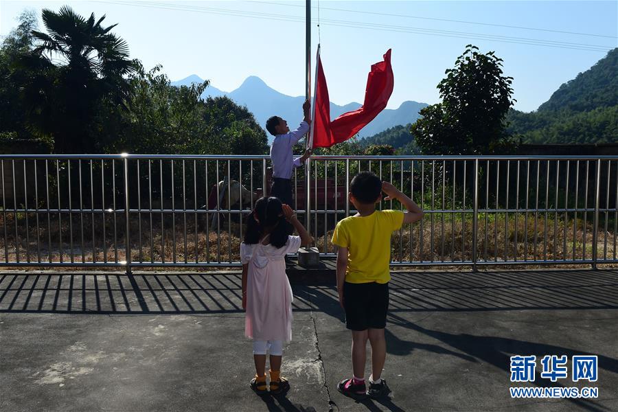 9月7日,在霍山县磨子潭镇金岩教学点,项发权带着两个孩子升国旗。新华社记者 黄博涵 摄
