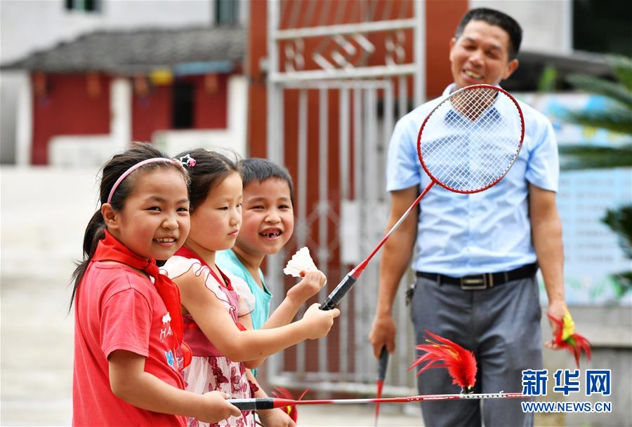 在永泰县红星乡淡洋小学,58岁的刘锡生老师(右一)给学校仅有的3名小学生上体育课(9月8日摄)。新华社记者魏培全摄