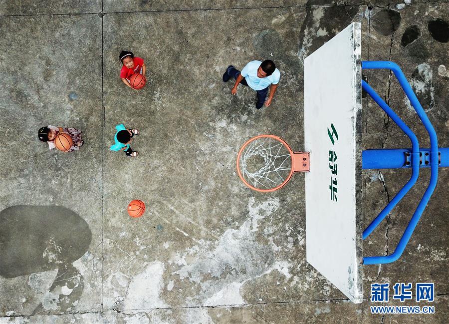 在课余活动时,红星乡淡洋小学仅有的3名小学生跟老师一起练习打篮球(9月8日摄,无人机照片)。新华社记者魏培全摄