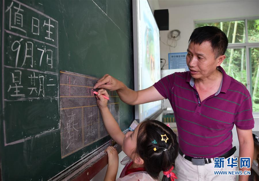 在永泰县红星乡淡洋小学,吴孟津老师(右)在教一年级学生刘迎喜写字(9月8日摄)。新华社记者魏培全摄