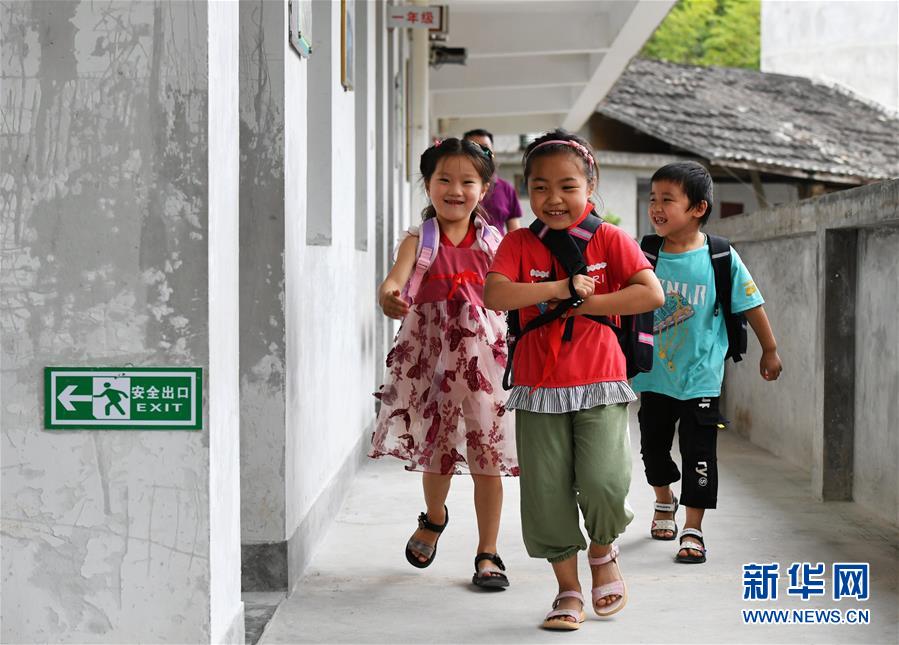 在永泰县红星乡淡洋小学,二年级的刘芷鑫(中)和一年级的刘宏洪(右一)、刘迎喜背着书包放学(9月8日摄)。 新华社记者魏培全摄