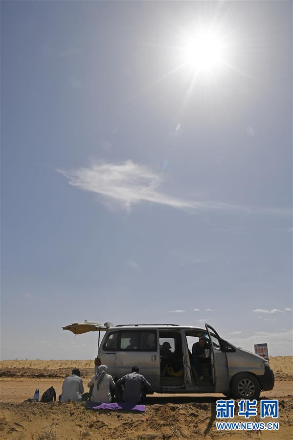 治沙工人在沙漠里休息,吃午饭(9月7日摄)。 新华社记者 王鹏 摄