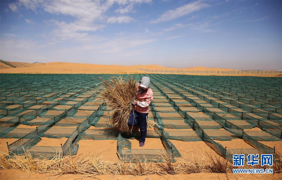 治沙工人在穿越腾格里沙漠腹地的乌玛高速青铜峡至中卫段搬运扎草方格的麦草(9月7日摄)。 新华社记者 冯开华 摄