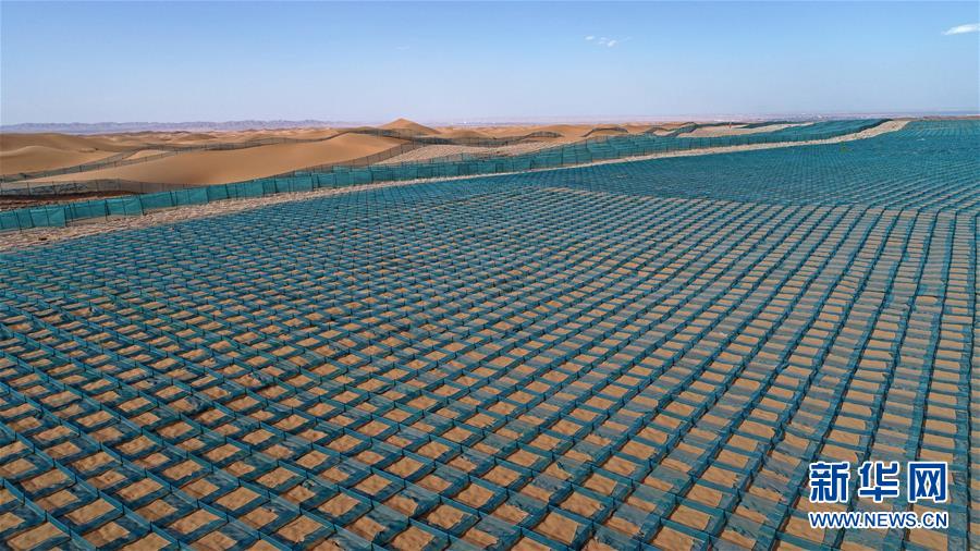 穿越腾格里沙漠腹地的乌玛高速青铜峡至中卫段施工现场修建的“六带一体”防护体系(9月7日摄,无人机照片)。 新华社记者 王鹏 摄