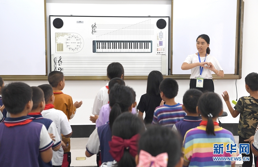 22岁的那仙老师在广西百色市凌云县泗城镇后龙村中心小学教孩子们唱歌(9月8日摄)。